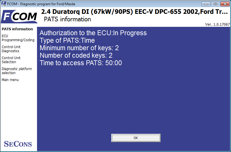 Το ξεκλείδωμα PATS εκτελείται αυτόματα πριν από οποιαδήποτε λειτουργία, δεν χρειάζεται να χρησιμοποιήσετε τη λειτουργία FCOM "PATS Login". Το PATS Login χρησιμοποιείται μόνο για δοκιμαστικούς σκοπούς (για επαλήθευση της ορθότητας του κωδικού) και για ορισμένες ειδικές λειτουργίες.
