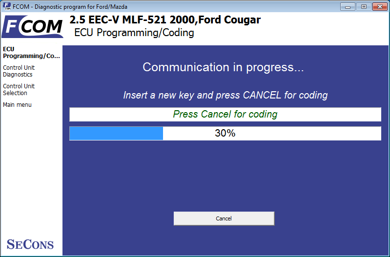 Στη συνέχεια, πατήστε το κουμπί Ακύρωση για να ξεκινήσει η διαδικασία κωδικοποίησης. Εάν αλλάζετε κλειδί, η ανάφλεξη δεν πρέπει να είναι σβηστή για περισσότερο από 10 δευτερόλεπτα.