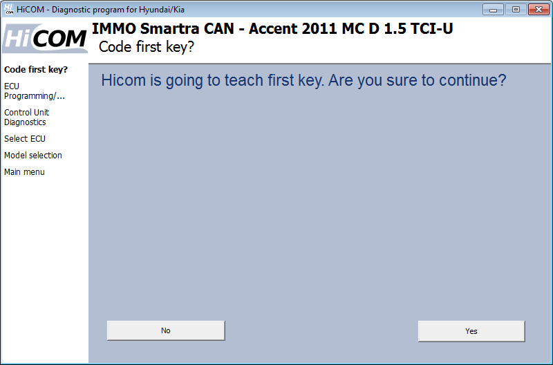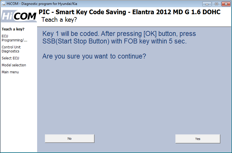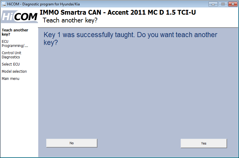 Θα σας ζητηθεί εάν θέλετε να κωδικοποιήσετε άλλο κλειδί. Εάν κάνετε κλικ στο "ναι", η HiCOM θα σας ζητήσει να εισαγάγετε το επόμενο κλειδί. Μπορούν να κωδικοποιηθούν έως και 4 πλήκτρα. (ορισμένες μονάδες ελέγχου επιτρέπουν μονάδες έως 8 πλήκτρα). Εάν κάνετε κλικ στο "Όχι", η διαδικασία κωδικοποίησης τερματίζεται και δεν προστίθενται άλλα κλειδιά.